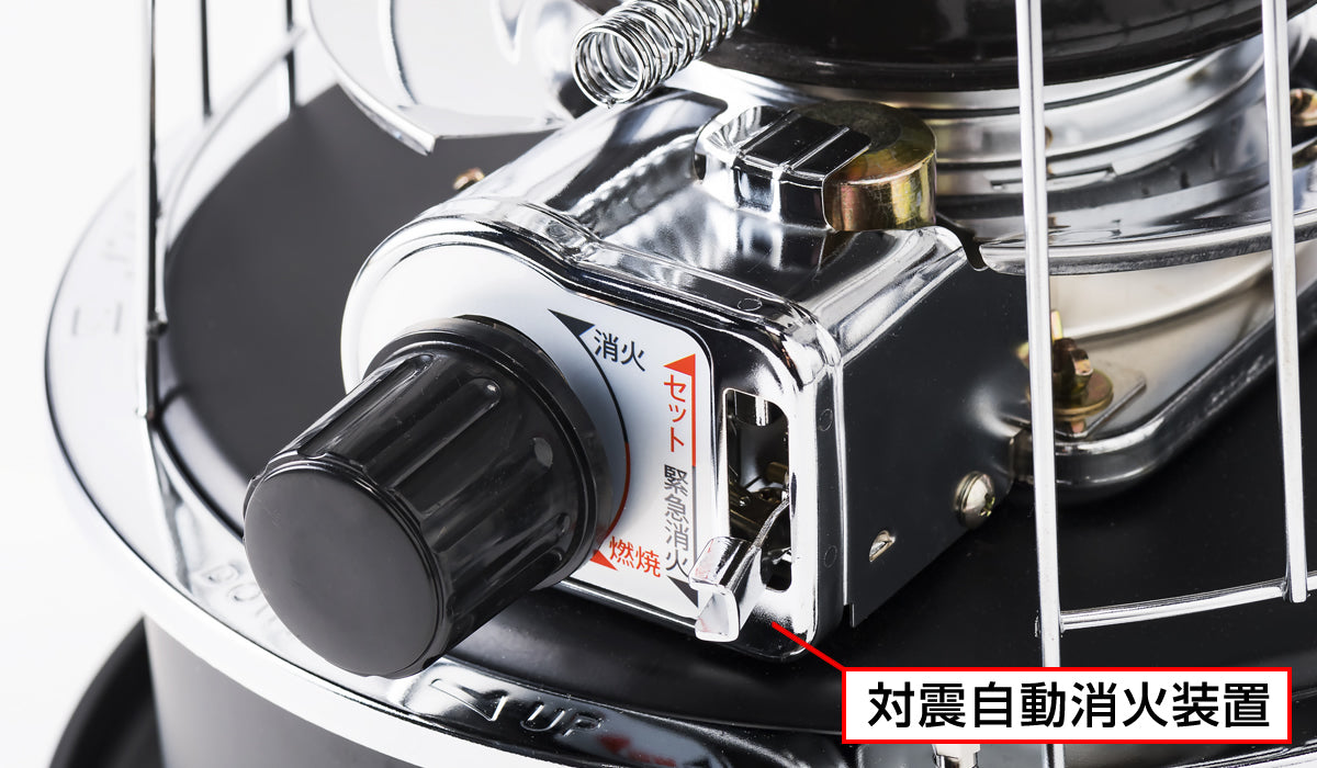 アルパカプラスストーブは対震自動消火装置付きです。ストーブが転倒したときはもちろん、ストーブに衝撃があったとき、大きな揺れを感じたときに自動消火装置が作動(しん降下式)し、安全に消し止められます。